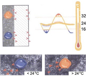 - Когда температура в помещении достигает 24°С, изоляционный двухфазный материал из твердого состояния переходит в жидкое, поглощая при этом значительную часть теплоты.