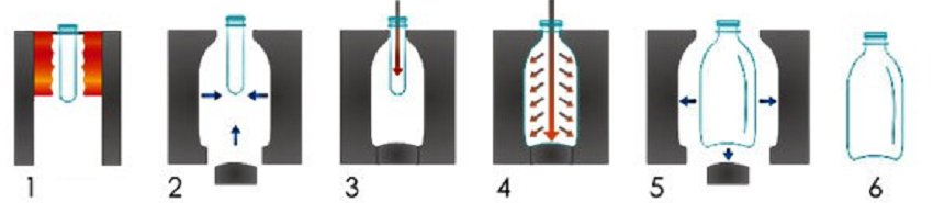 В оборудовании используется двухэтапный процесс производства. Первый шаг – это производство преформ на пластоформовочном оборудовании. Ввиду высокой стоимости подобного оборудования, ПЭТ-преформы обычно поставляются сторонним производителем. Вторым шагом производства ПЭТ-бутылок является их выдув из преформ при использовании данного оборудования.