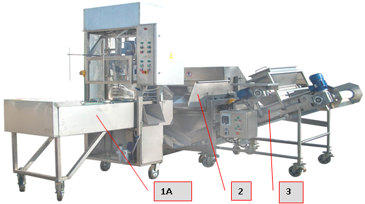 1A-полуавтоматическая двухрядовая установка, обслуживающий персонал накладывает капустные качаны на острые шипы, соединенные цепной лентой, посредством которой передвигается под вращающийся ножевой механизм. Вращаясь, ножи выполняют возвратно-поступательное движение, вырезая тем самым капустную кочерыжку. Далее качаны попадают в загрузочный лоток