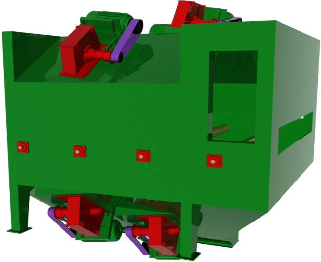 Снаружи камеры установлены 4 дробеметных аппарата под наиболее оптимальным углом для получения хорошей струи дроби. Внутри дробеметной камеры расположены защитные пластины толщиной 12мм из материала ZGMn13, срок службы 5 лет. Пластины расположены «внахлест», прикрепляются специальными гайками из литой стали.